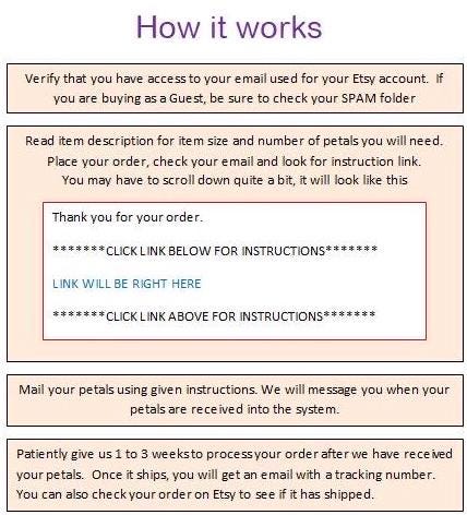 After placing your order, we need to receive your flowers within 4 weeks of your order date. If we do not receive your petals within this time frame, you will receive a friendly reminder to send us your flowers. At this point you can choose to send your petals, cancel the order or the order can be fulfilled with our own petals. If we do not receive a response from you within 1 week of the reminder, your order may be completed with our flowers. This is due to policies put on us for late order and for having a lot of returns.