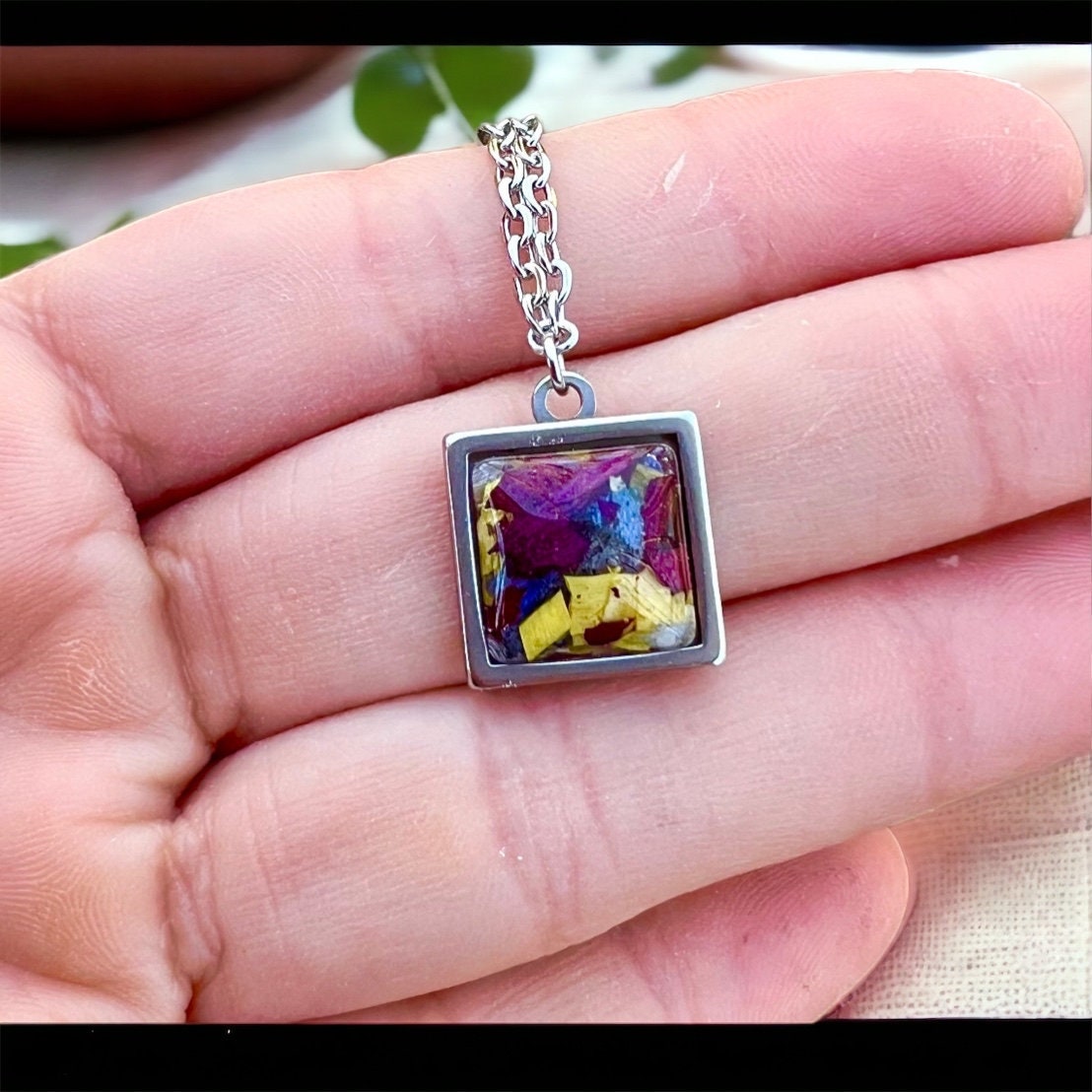 12mm Stainless Steel Square pendant. Memorial Jewelry, Memorial beads. Wedding flowers. Funeral flowers. Made with real flowers