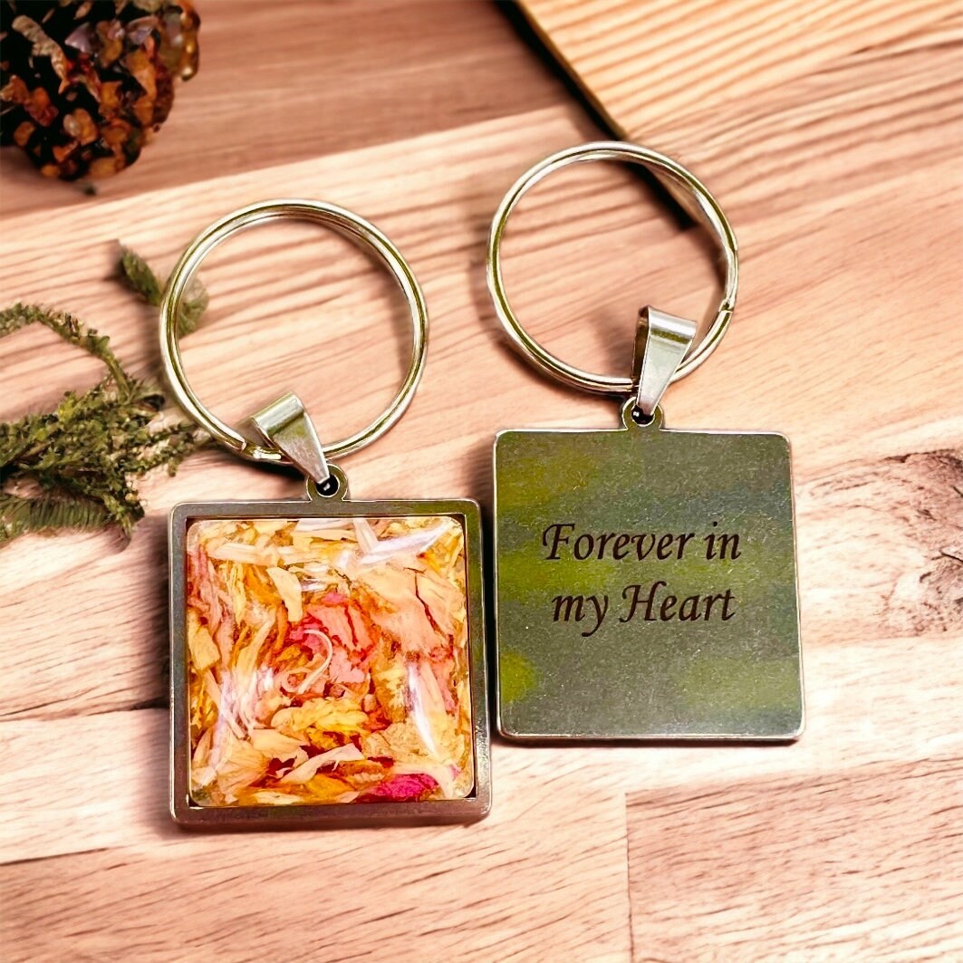 Stainless Steel Square keychain. Memorial Jewelry, Memorial beads. Wedding flowers. Funeral flowers. Made with real flowers