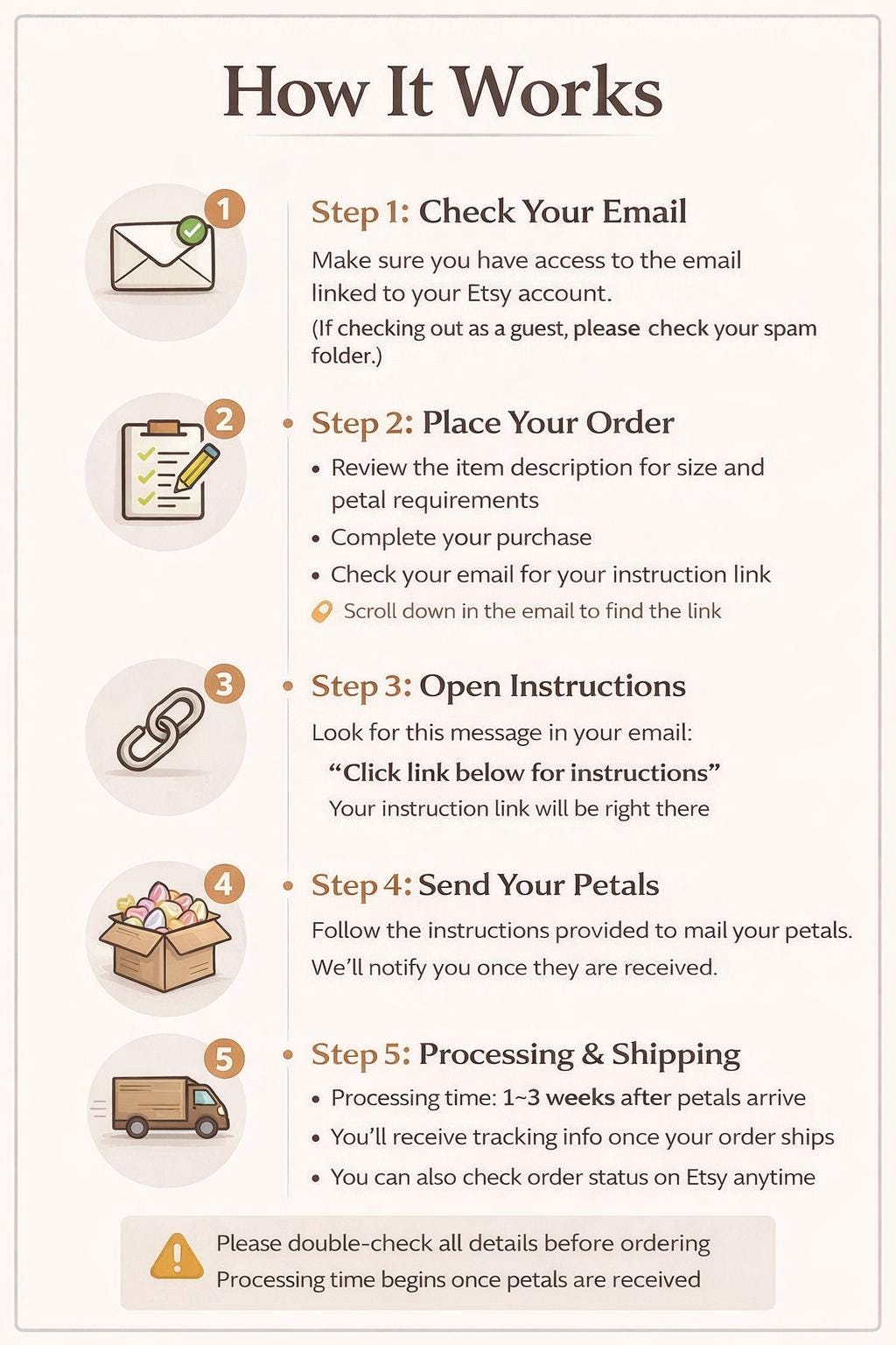 This helps prevent any mix-ups and ensures your petals are properly labeled, handled, and matched to the correct order. Following these steps allows me to safely receive and process your flowers with the care they deserve.