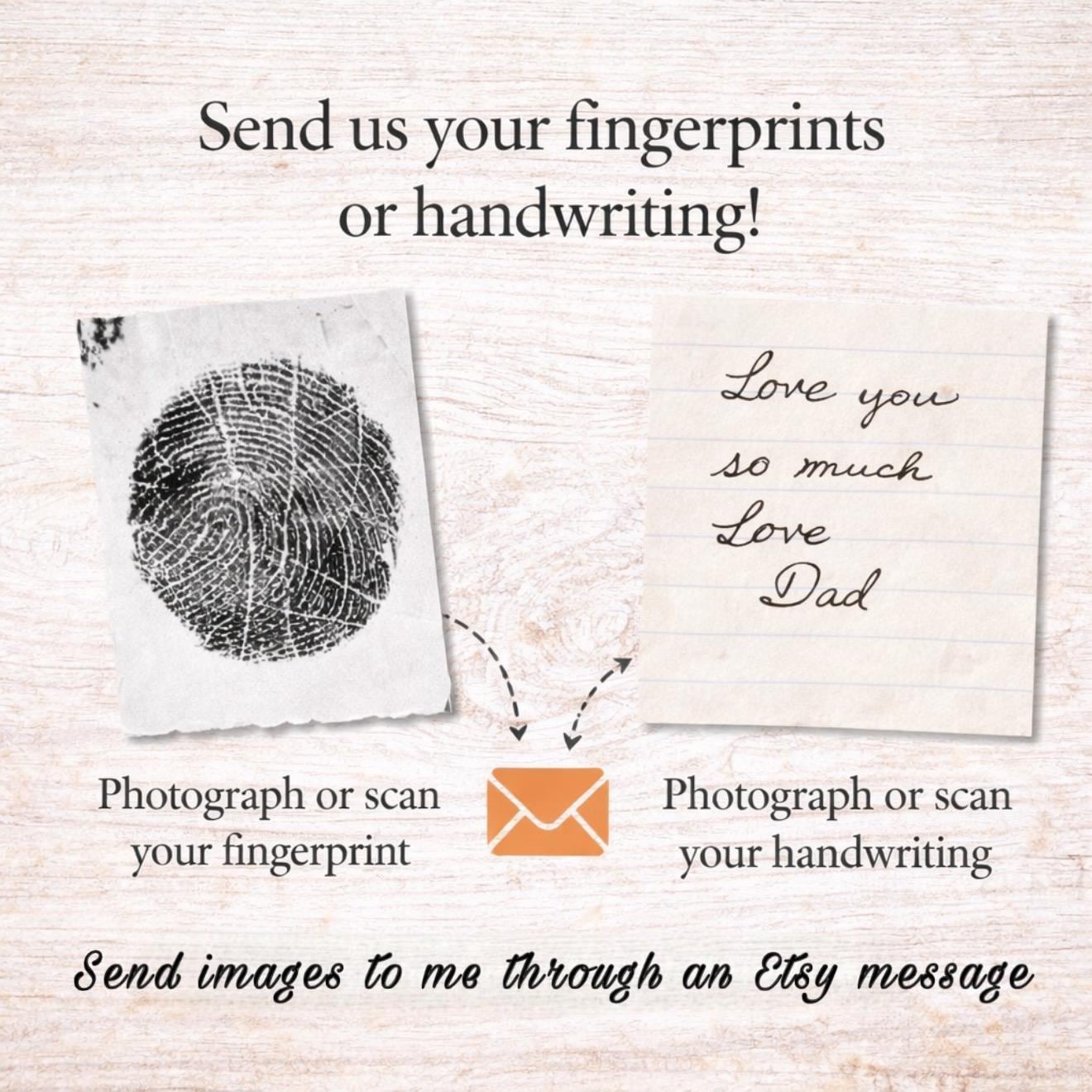 After placing your order, please send your fingerprint images through Etsy messages. If the image does not attach on your first message, simply send a second message and attach the file there.