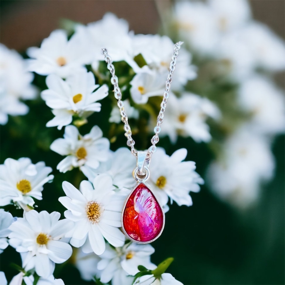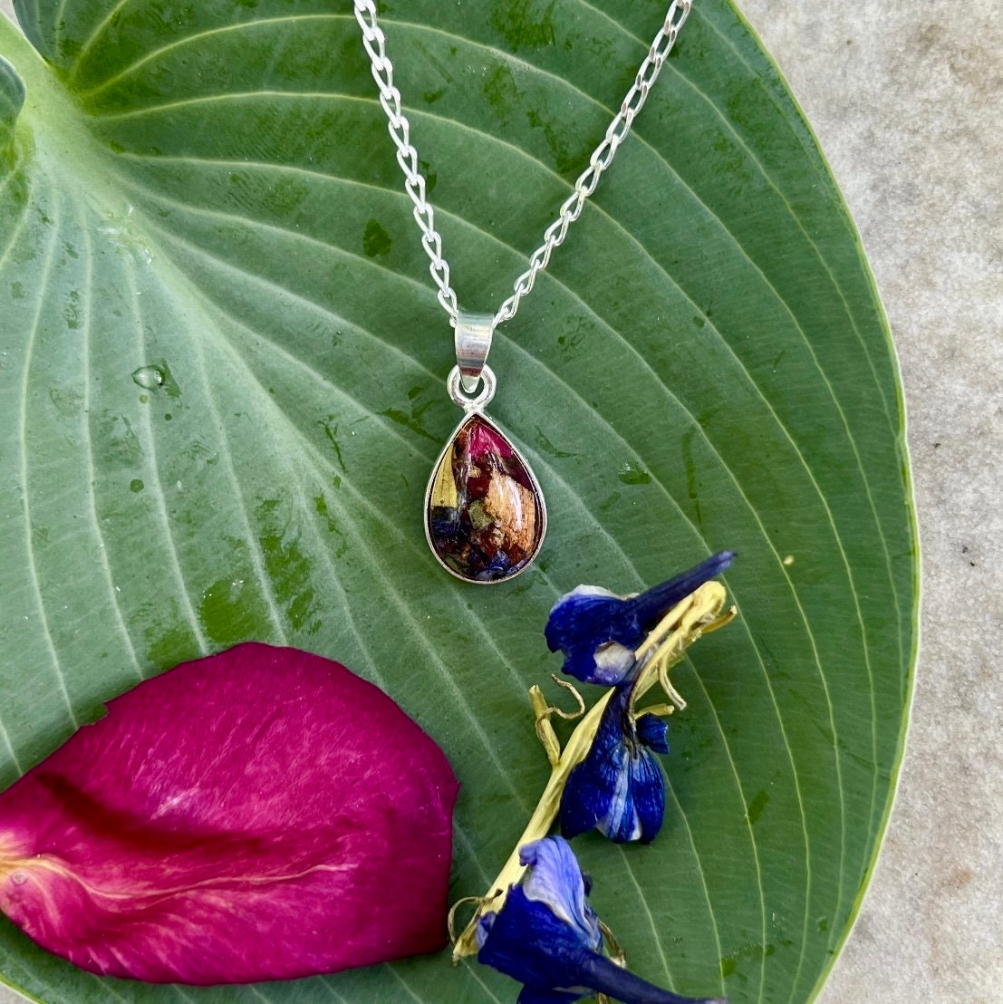 Sterling silver tear drop necklace. Memorial Jewelry, Memorial Beads. Wedding Flowers. Funeral Flowers.Made with real flowers