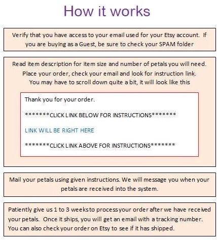 After placing your order, we need to receive your flowers within 4 weeks of your order date. If we do not receive your petals within this time frame, you will receive a friendly reminder to send us your flowers. At this point you can choose to send your petals, cancel the order or the order can be fulfilled with our own petals. If we do not receive a response from you within 1 week of the reminder, your order may be completed with our flowers. This is due to policies put on us for late order and for having a lot of returns.