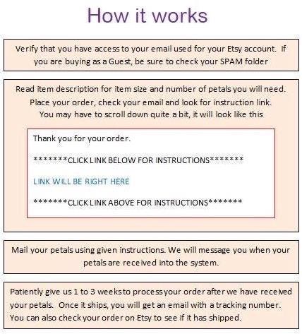After placing your order, we need to receive your flowers within 4 weeks of your order date. If we do not receive your petals within this time frame, you will receive a friendly reminder to send us your flowers. At this point you can choose to send your petals, cancel the order or the order can be fulfilled with our own petals. If we do not receive a response from you within 1 week of the reminder, your order may be completed with our flowers. This is due to policies put on us for late order and for having a lot of returns.