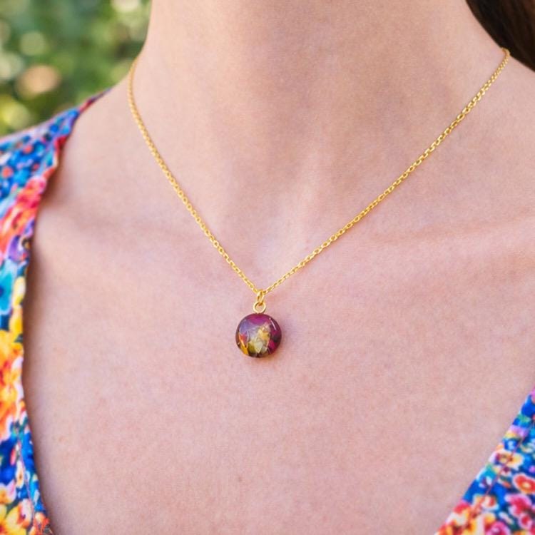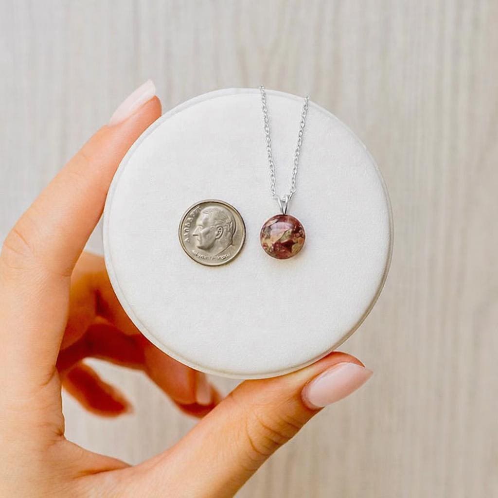 This custom memorial necklace is handcrafted using your real flowers, creating a deeply meaningful keepsake you can cherish forever. Whether your flowers are from a funeral, celebration of life, or a special moment you never want to forget, this piece transforms them into something lasting and personal.