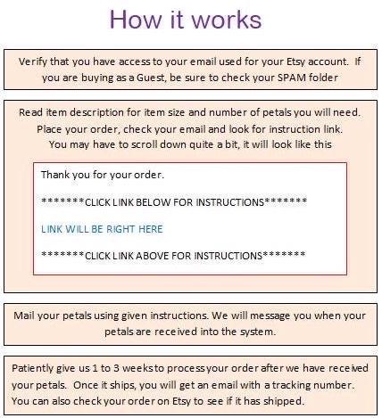 After placing your order, we need to receive your flowers within 4 weeks of your order date. If we do not receive your petals within this time frame, you will receive a friendly reminder to send us your flowers. At this point you can choose to send your petals, cancel the order or the order can be fulfilled with our own petals. If we do not receive a response from you within 1 week of the reminder, your order may be completed with our flowers. This is due to policies put on us for late order and for having a lot of returns.