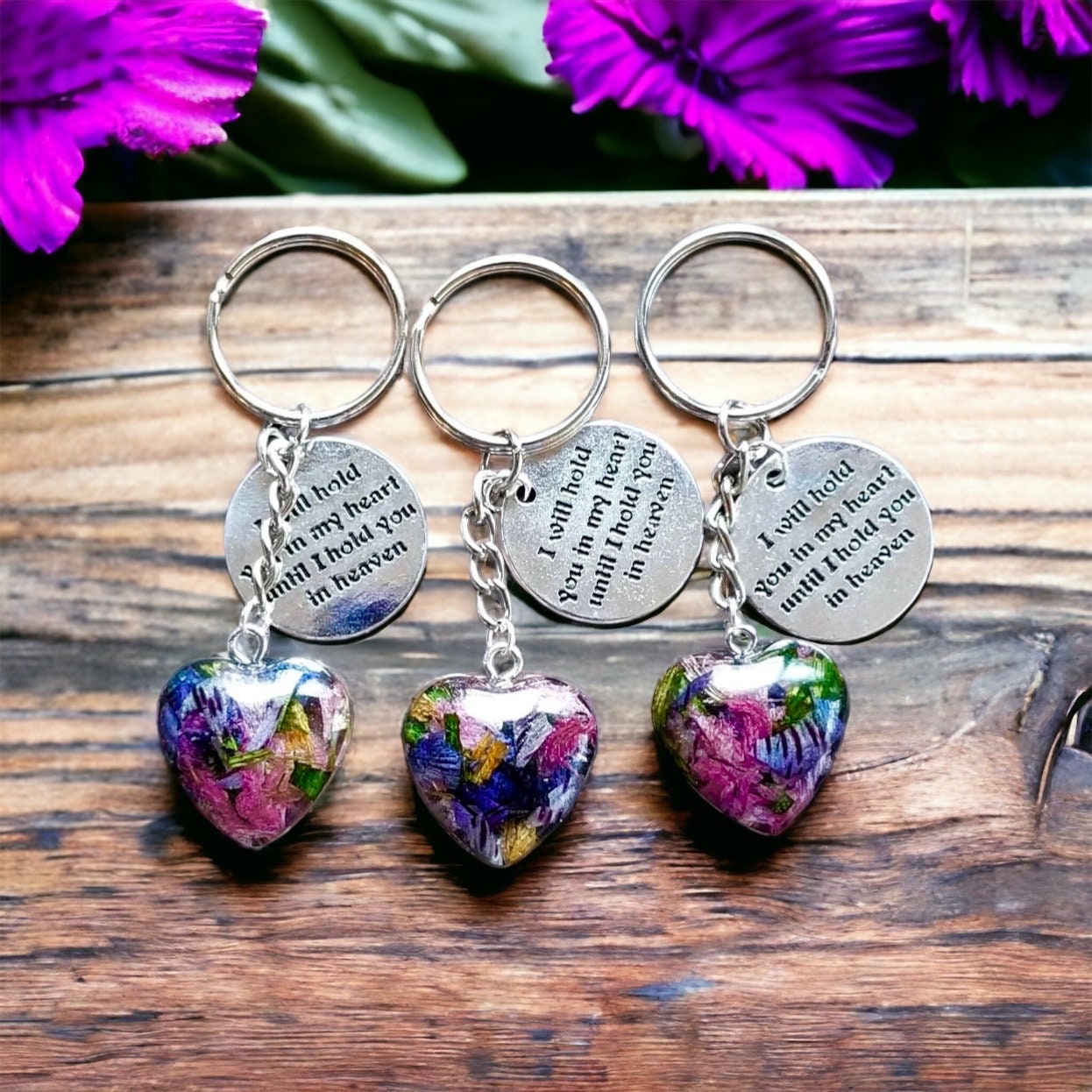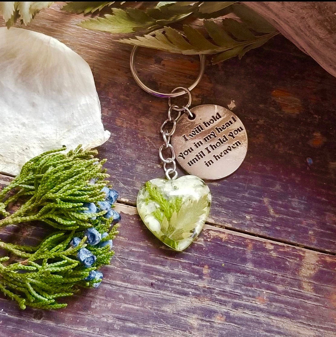 Keychain made with funeral flowers. Memorial Jewelry from petals. Memorial gifts. Wedding gifts. Made with real flowers. Heart keychain