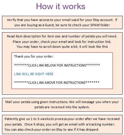 After placing your order, we need to receive your flowers within 4 weeks of your order date. If we do not receive your petals within this time frame, you will receive a friendly reminder to send us your flowers. At this point you can choose to send your petals, cancel the order or the order can be fulfilled with our own petals. If we do not receive a response from you within 1 week of the reminder, your order may be completed with our flowers. This is due to policies put on us for late order and for having a lot of returns.