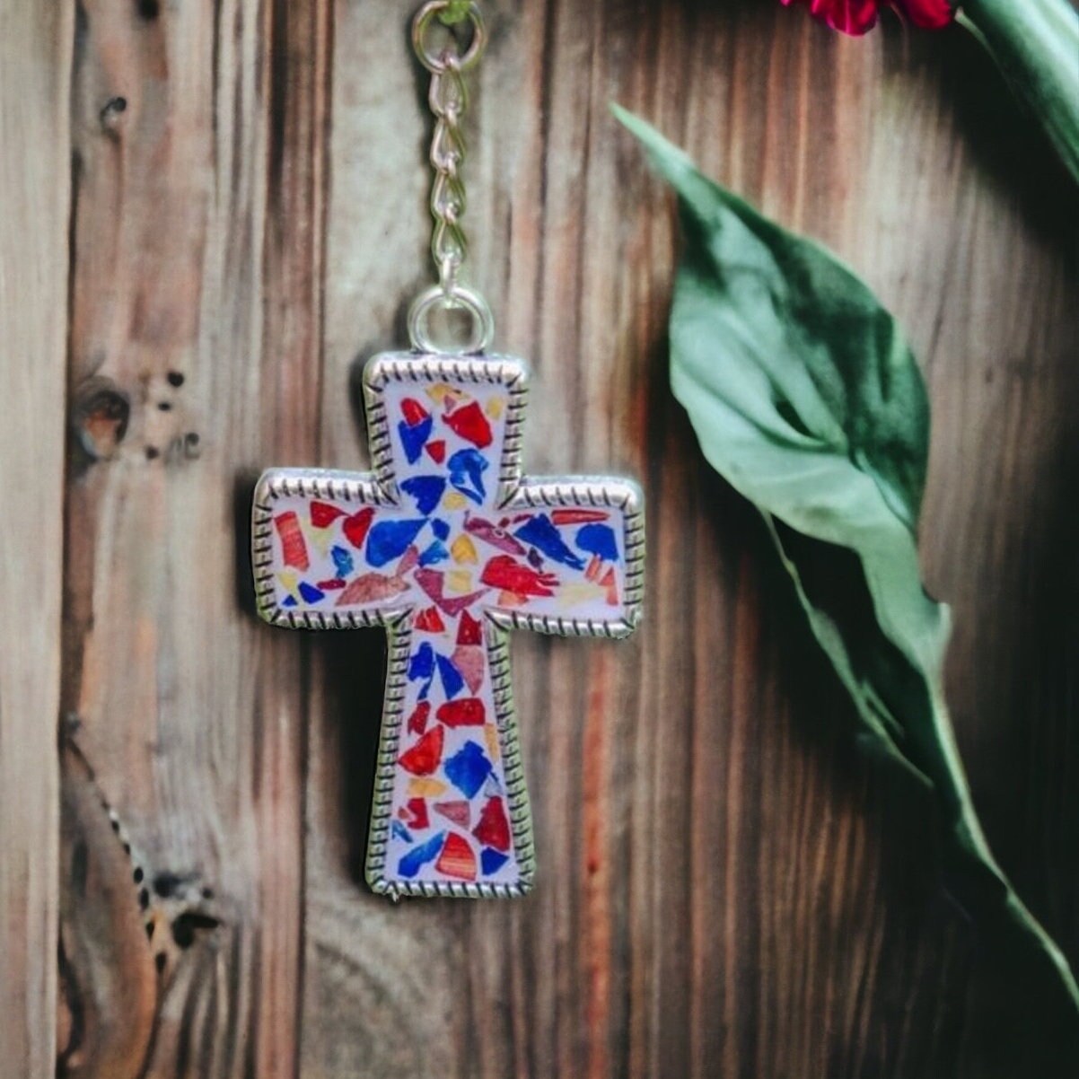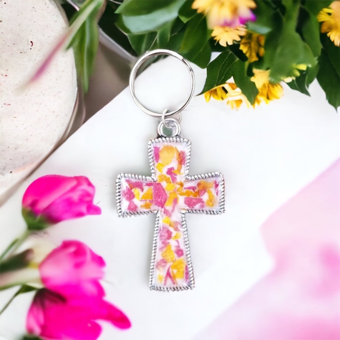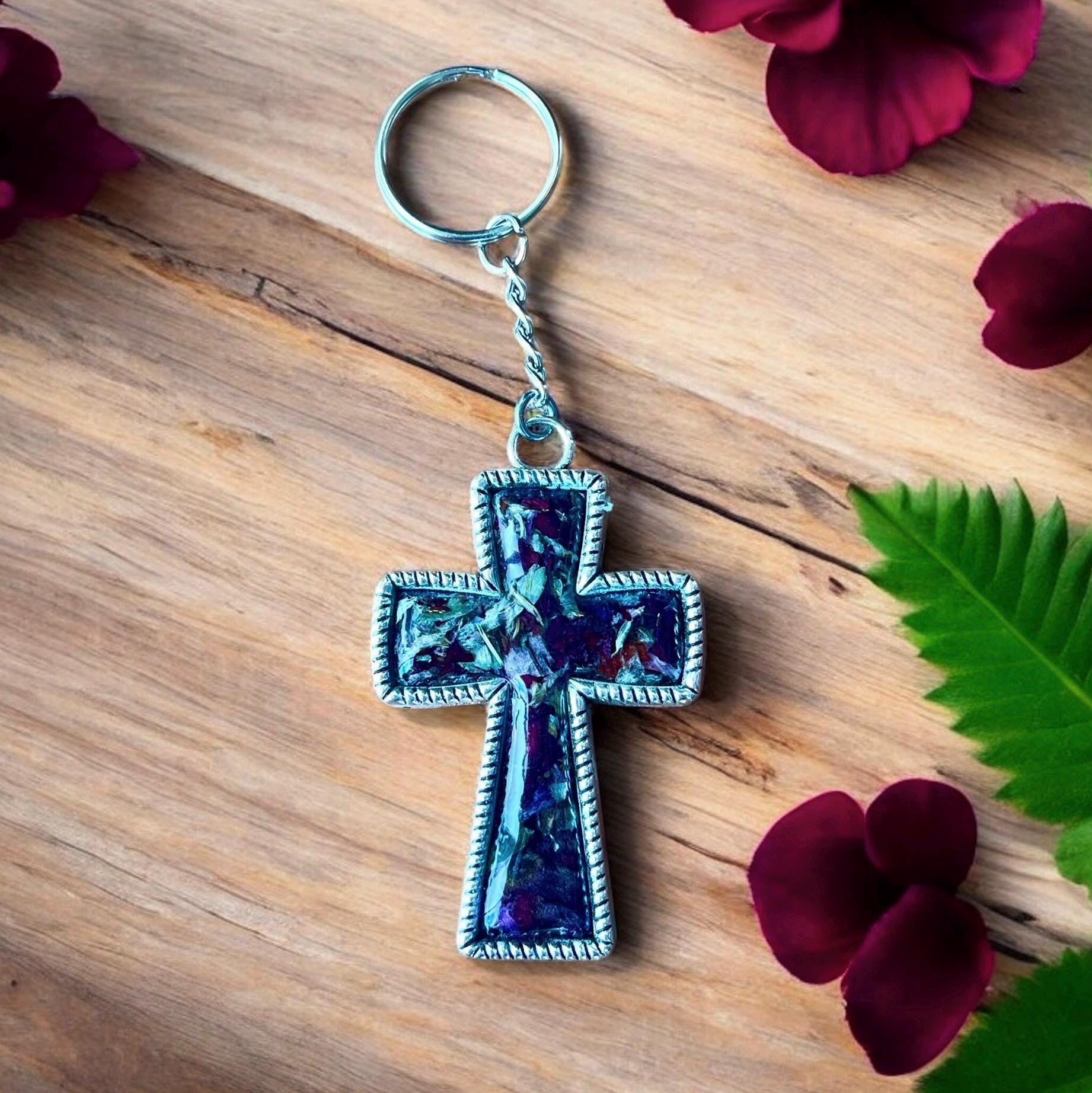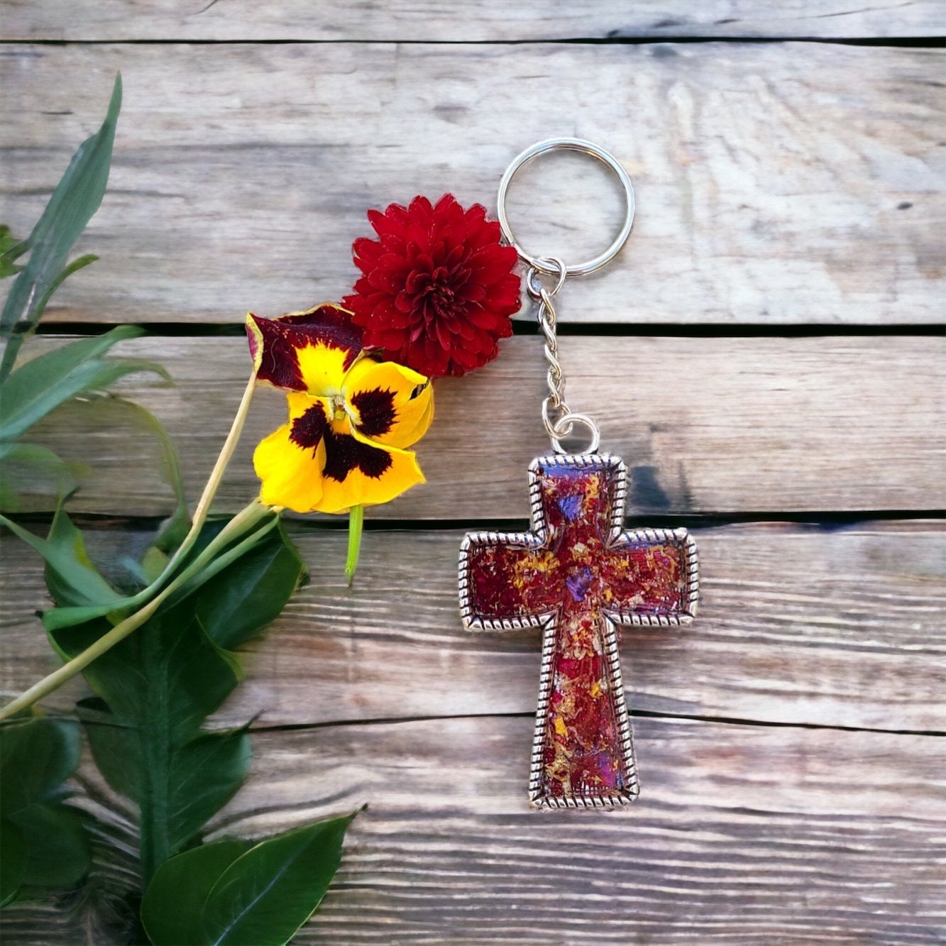 Flower petal cross keychain. Memorial Jewelry, Cross Ornament. Memorial Beads. Wedding Flowers. Funeral Flowers. Made with real flowers