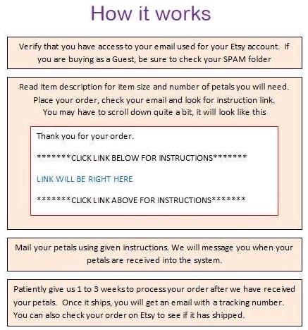 After placing your order, we need to receive your flowers within 4 weeks of your order date. If we do not receive your petals within this time frame, you will receive a friendly reminder to send us your flowers. At this point you can choose to send your petals, cancel the order or the order can be fulfilled with our own petals. If we do not receive a response from you within 1 week of the reminder, your order may be completed with our flowers. This is due to policies put on us for late order and for having a lot of returns.